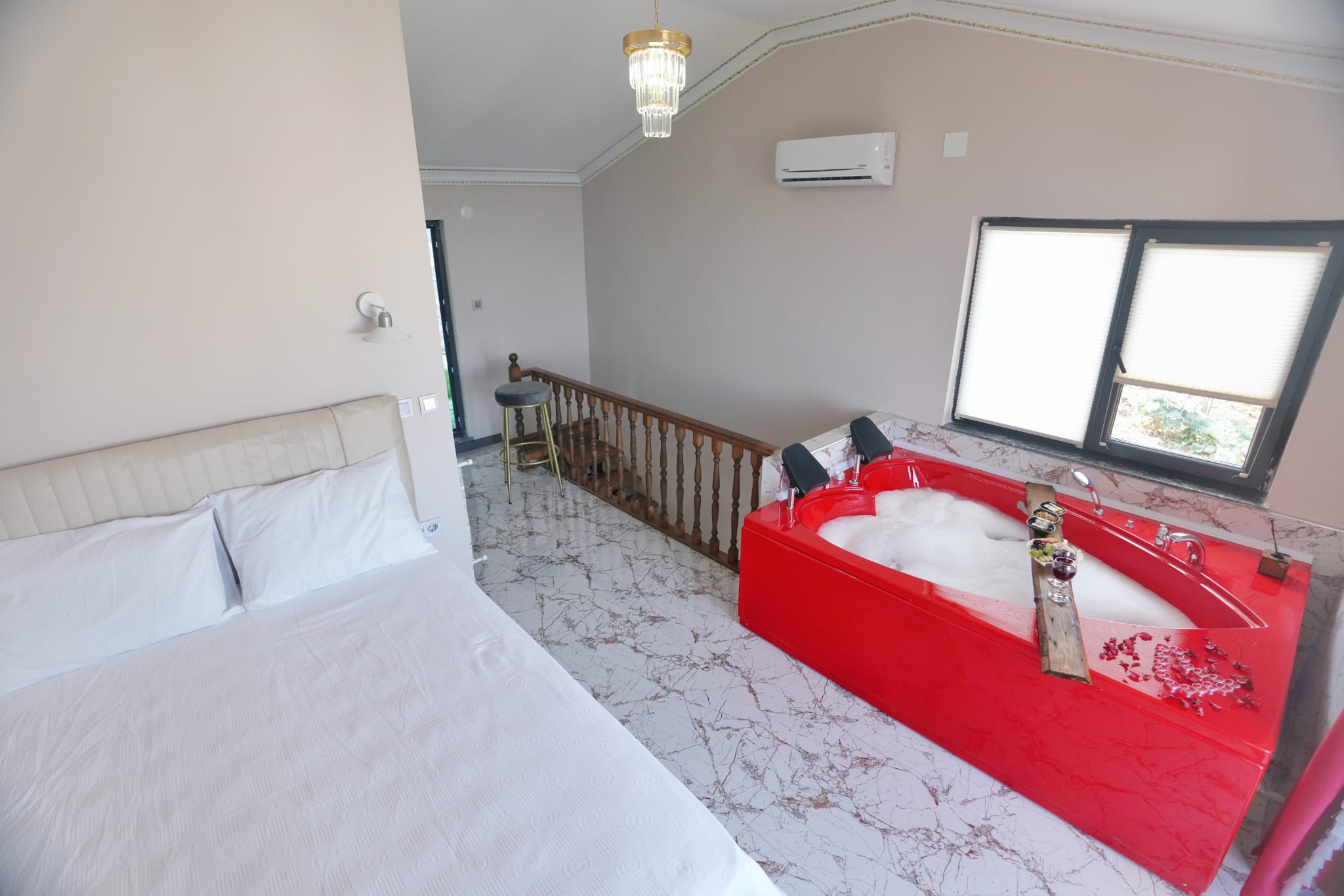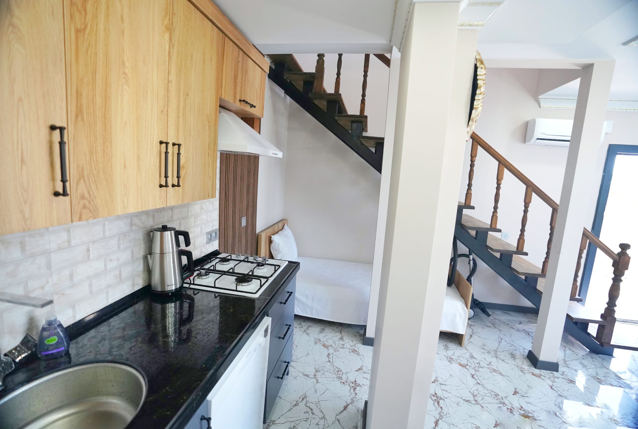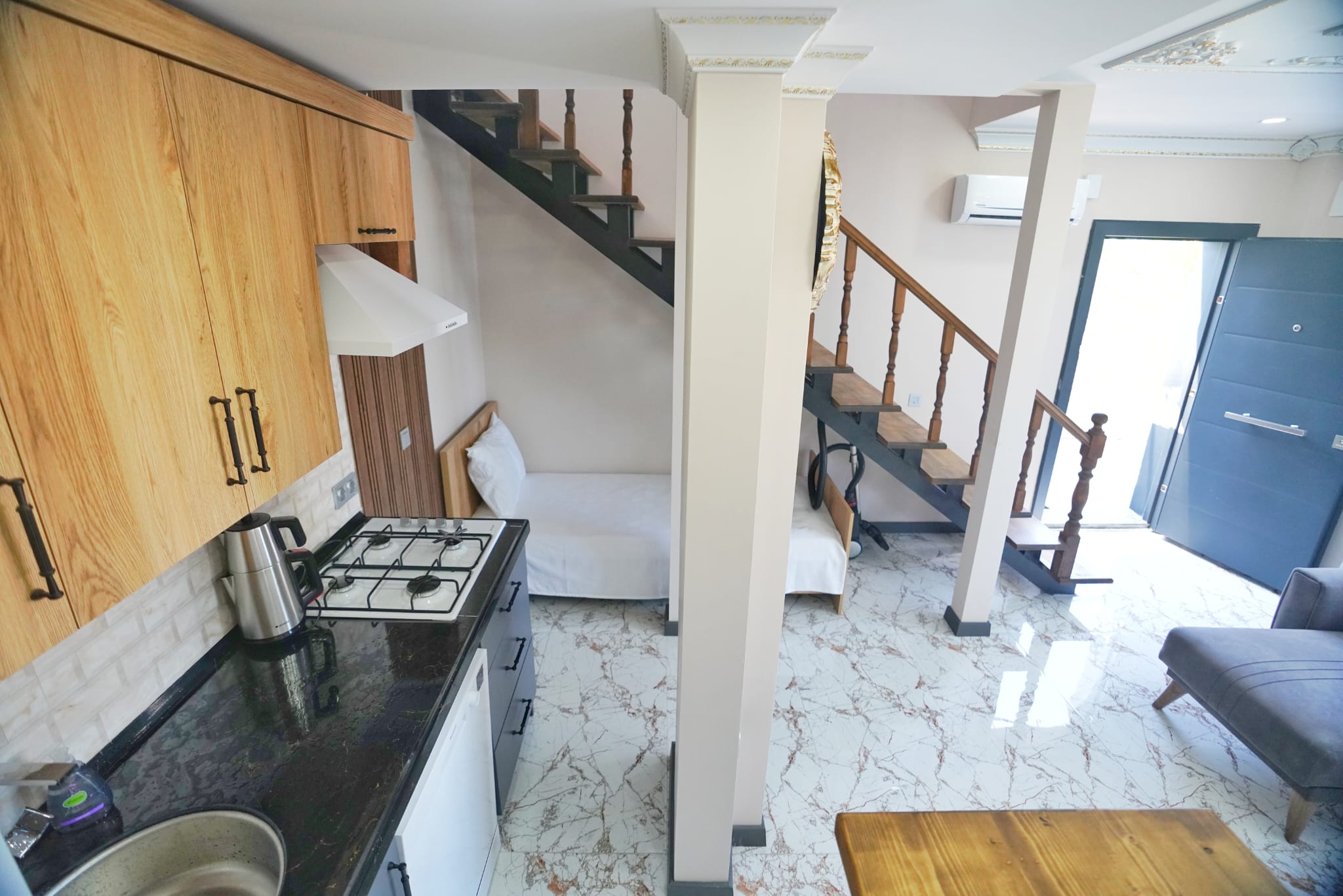 55 m²1+1 Villamız dublex olup, Balayı çiftler için tasarlanmıştır. Villada 3-4 kişi konaklama imkanına sahiptir. Villamız devlet sahil yolunun hemen üzerinde olup full deniz manzaralıdır. Villamızın giriş katında salon-mutfak ve 1 adet tek kişilik yatak mevcuttur. Ayrıca salonda L oturma grubu vardır. 2. katta Yatak Odası vardır. Yatak odasının içinde Çift kişilik King Yatak Odası takımı, Jakuzi, Banyo, Tuvalet ve balkonu vardır. Villamız full donanımlı olup misafirlerimzin aradığı bütün ev eşyaları mevcuttur. Villamızın eşyaları lüks konseptte dekore edilmiştir. Villamzda 2 adet 12.000 Btu İnverter Klima mevcuttur.